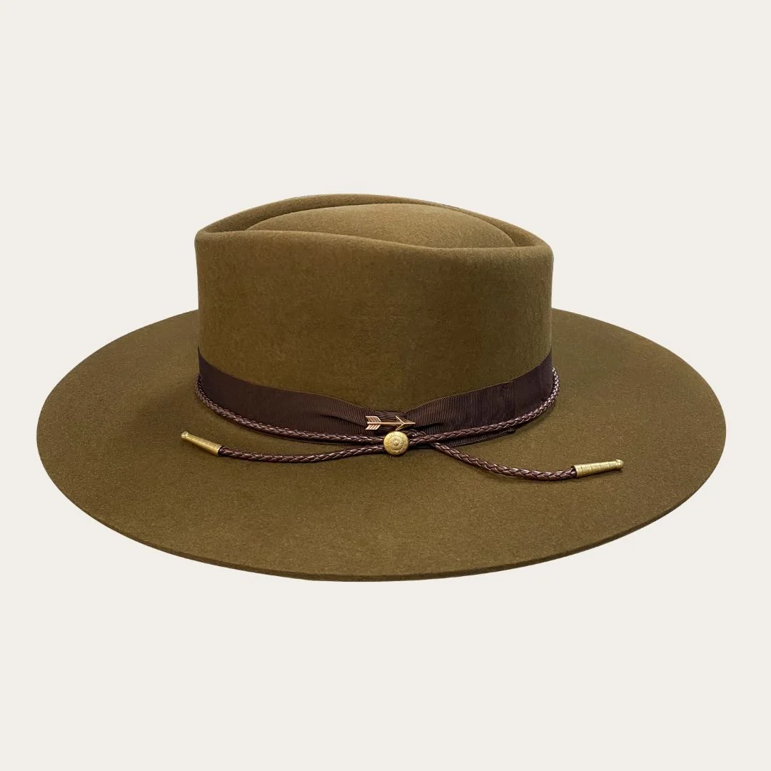 An iconic look and an American original. The Dylan is proudly made in Garland, Texas from firm, high-quality wool felt and features a distinctive diamond crown, cowhide sweatband, ribbon hatband with a braided cord finished with a silver arrow pin. Its wide, flat brim offers reliable shelter in a storm, keeping you covered when the hard rain falls.