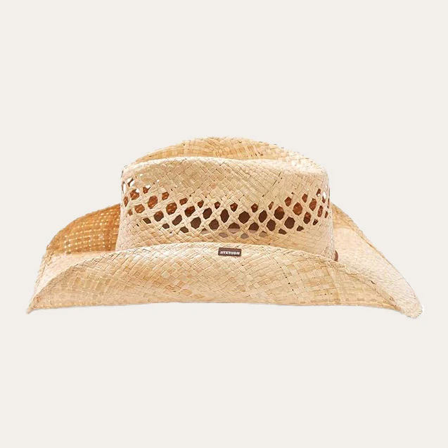 The Madrid Cowboy Hat is constructed of soft finish raffia and features a pinch front vented crown, Dri-lex interior sweatband and leather hat band with turquoise accent.